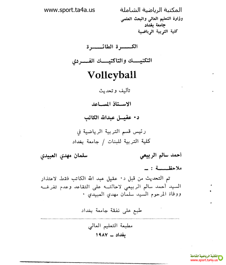 الكرة الطائرة الحديثة ومتطلباتها التخصصية المؤلف أ.د ناهدة عبد زيد الدليمى د. عادل مجيد خزعل د. رائد محمد مشتت كتاب في التربية البدنية يعرف بالكرة الطائرة ويذكر خصائصها ومتطلباتها والأداء الفني