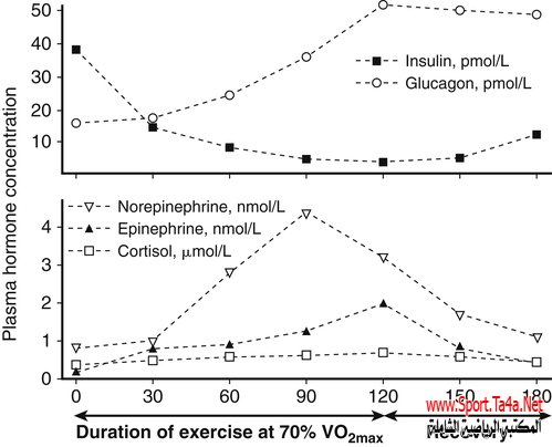 يزيد التمرين لفترة طويلة من تركيز عدة هرمونات مثل الادرينالين, الكورتزول, جلكوجون وهرمون النمو ويخفض من تركيز الانسولين, تمتلك هذه الهرمونات الاربعة الدور الرئيسي في ادامة تركيز ثابت لسكر الدم وتعرف بالهرمونات المنظمة للسكر