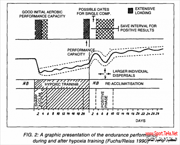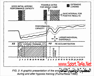 شكل رقم 02 : يمثل العرض البياني لأداء التحمل أثناء و بعد تدريبات نقص الأكسجين (فوكس / ريس 1990) .