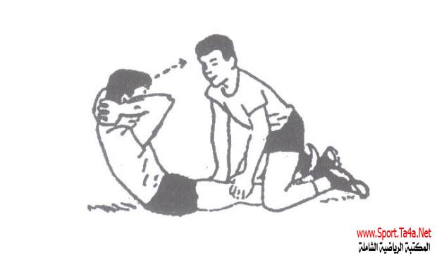 اختبار الجلوس من الرقود مع ثنى الركبتين لقياس تحمل القوة يؤدى بحيثيتم تشبيكالكفين خلف الرقبة .
