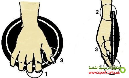 يحمل القرص على المفاصل الاخيرة للاصابع ( سلاميات الاصابع ) وتشير الاصابع الى حافة القرص . يستند القرص على رسغ اليد ويستند الابهام على القرص ويكون الرسغ مسترخى وعلى كامل استقامته .