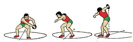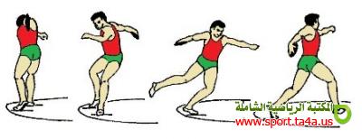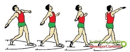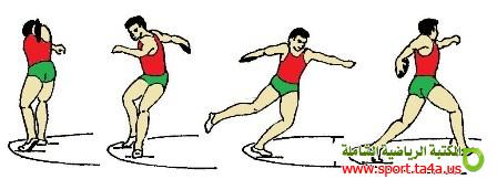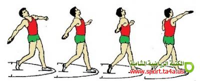 6-من ثلاث خطوات اقتراب بالمشي ثم الدوران نصف دورة والرمي مبتدئا الحركة بالقدم اليسرى حتى تكون القدم اليسرى أماما لحظة الرمي .