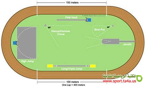 1.ان الطول القياسي للمضمار يجب ان يكون 400 م ويتكون من مستقيمين متوازيين ومنحنيين يتساوى فيهما نصف القطر .