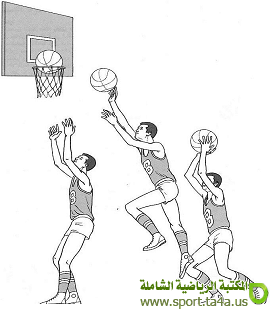 1- الجري في اتجاه الهدف من زاوية 45 5 تقريباً لمحاولة لمس الجزء القريب من اللوحة الخلفية باليد المجاورة عقب الارتقاء بإحدى القدمين