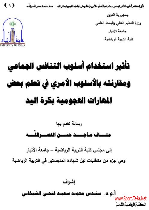 برجاء ذكر المصدر حتى تعم الفائدة :المكتبة الرياضية الشاملة : تأثير استخدام أسلوب التنافس الجماعي ومقارنته بالأسلوب ألأمري في تعلم بعض المهارات الهجومية بكرة اليد